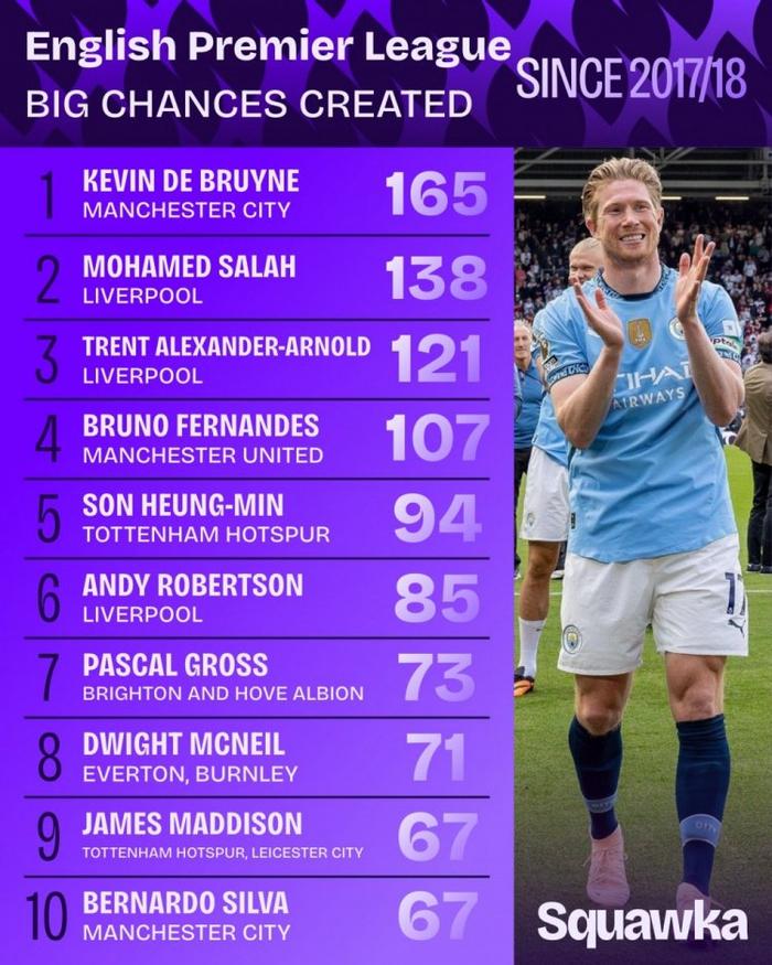 直播吧9月7日讯 数据机构squakwa统计了17-18赛季以来的英超创造重大机会情况,德布劳内力压萨拉赫居首。
